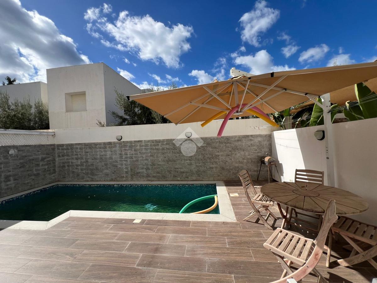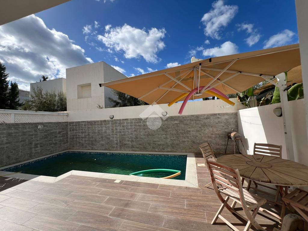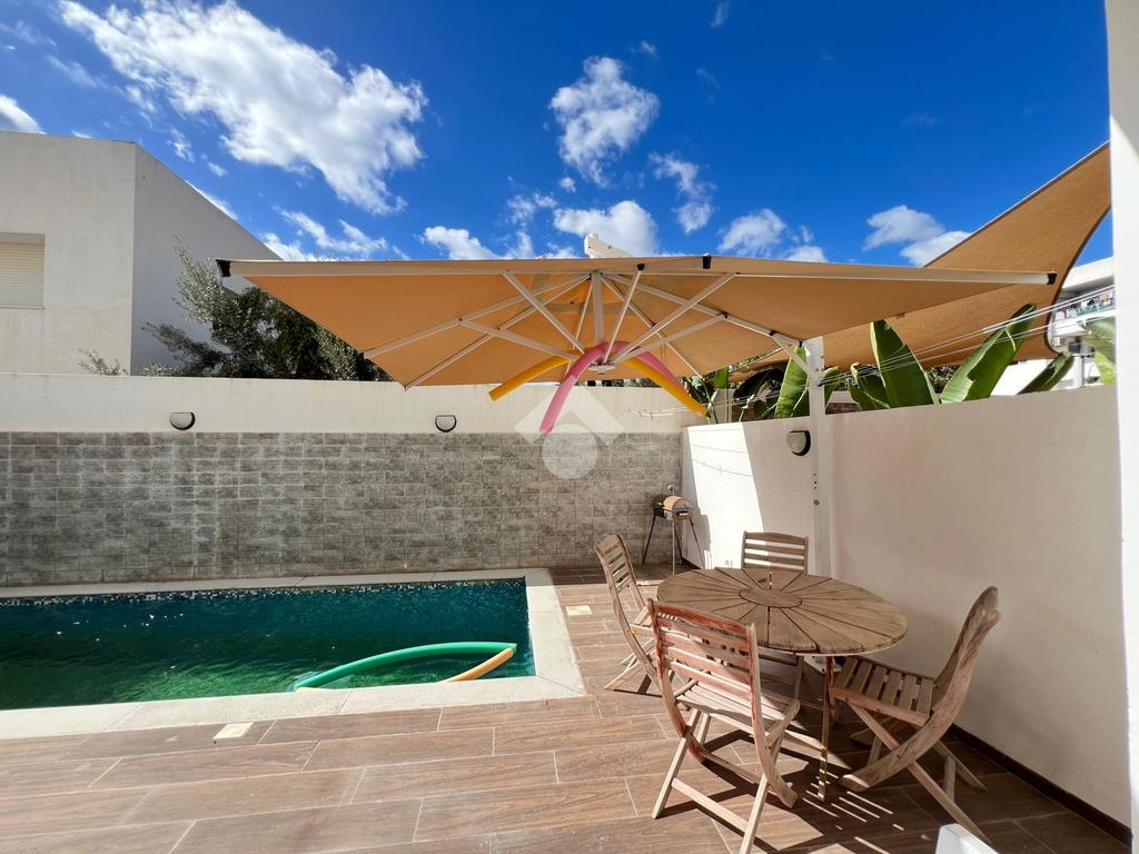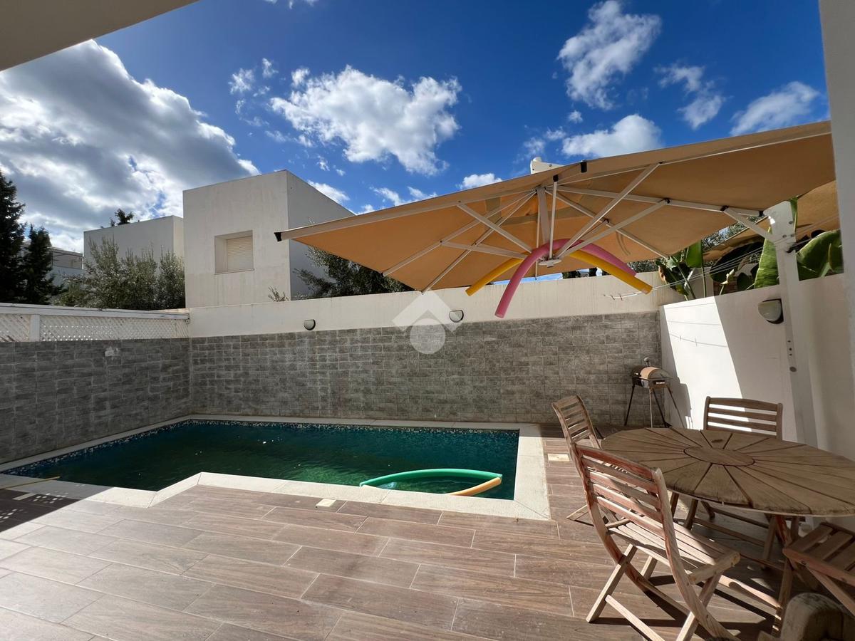 Le salon spacieux et lumineux, ainsi que la salle à manger, s’ouvrent sur une terrasse avec piscine privée.
