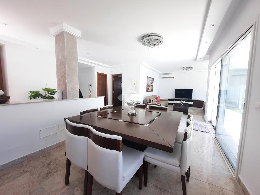 La partie jour se compose d’un salon lumineux ouvrant sur une salle à manger avec accès au jardin et à la piscine,