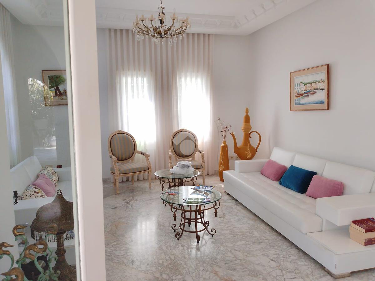L’entrée ouvre sur un salon spacieux, pouvant accueillir deux coins salon, avec un accès direct à la terrasse, au jardin et à la piscine.