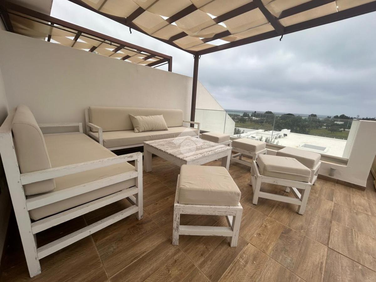 Une chambre à coucher avec un placard partage la même terrasse que la suite.